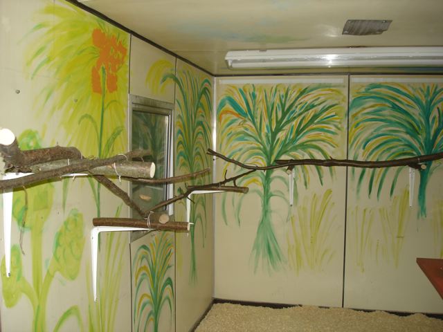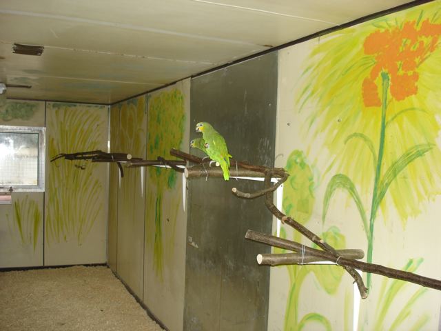 Eine Freundin und ich kümmern uns um die Papageien dort. Im Moment wird eine neue Voliere erstellt bzw. umgebaut, der Innenraum/Schutzraum ist fertig. Der Aussenbereich ist 3 m hoch und hat ca. 50 m2, davon sind ca. 16 m2 überdacht und an 3 Seiten geschützt, innen sind es knapp 20 m2. Die Gruppe besteht aus: