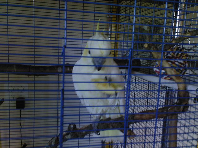 Mich wollte sie durch den Käfig beissen was ihr nicht gelang. Als ich wieder zu ihr hinging mit Et auf der Schulter kam sie ganz an das Gitter um zu schauen. Der Et war das egal. Der FLoh zeigte Interesse! Er ging nicht zu dem Käfig, aber er schaute immer wieder hin und lauschte den Tönen von Wendi.